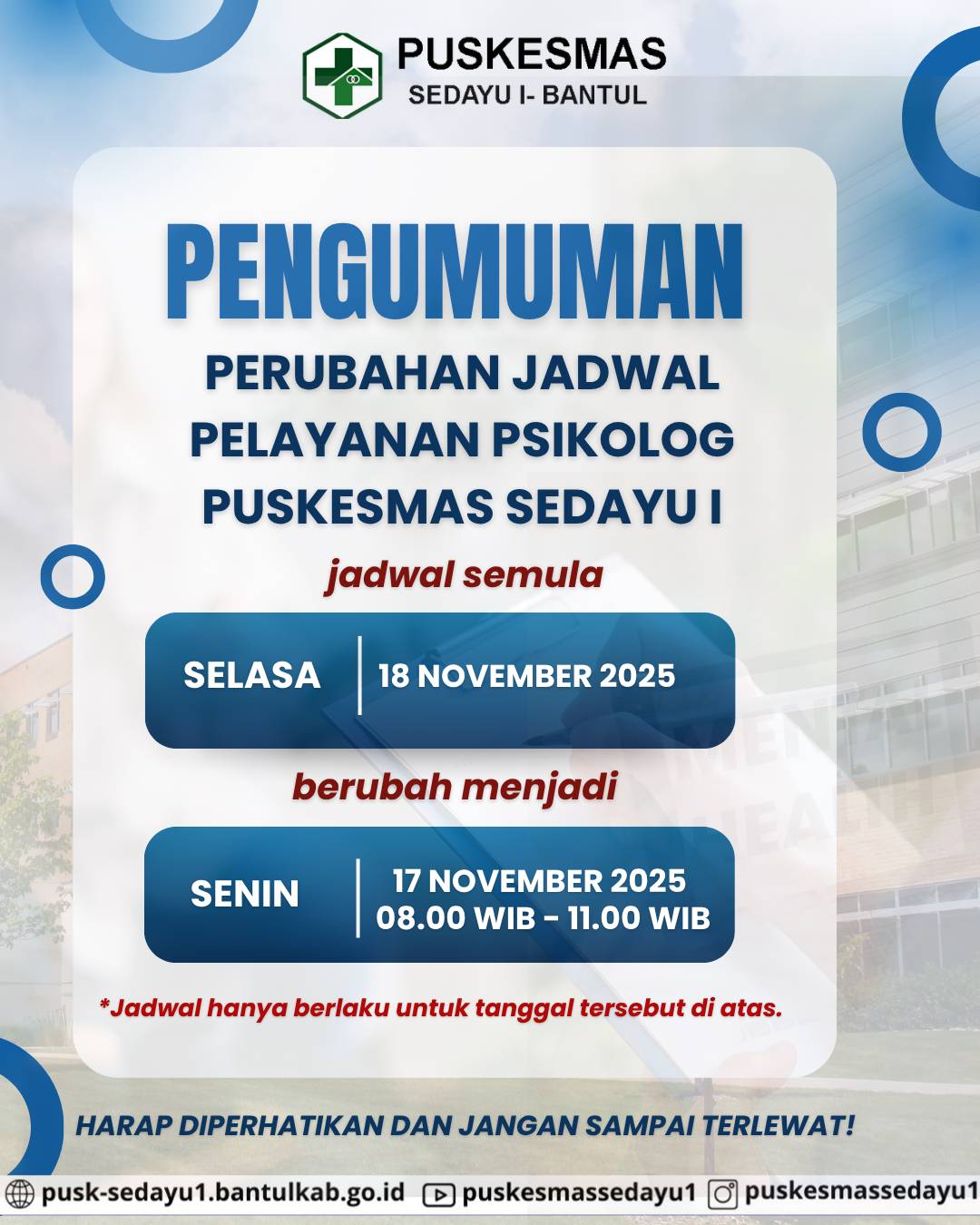 berikut kami sampaikan jadwal perubahan pelayan Psikolog untuk 2 minggu ke depan di Puskesmas Sedayu I