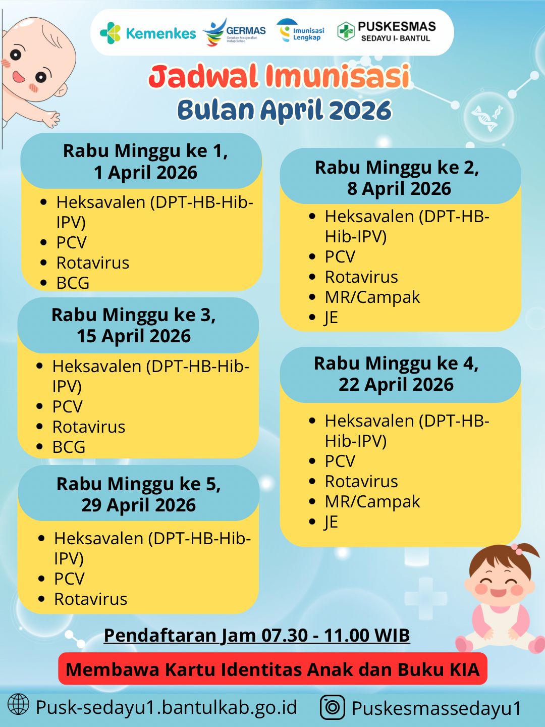 Berikut kami informasikan jadwal pelayanan imunisasi bulan April tahun 2026 di Puskesmas Sedayu I
