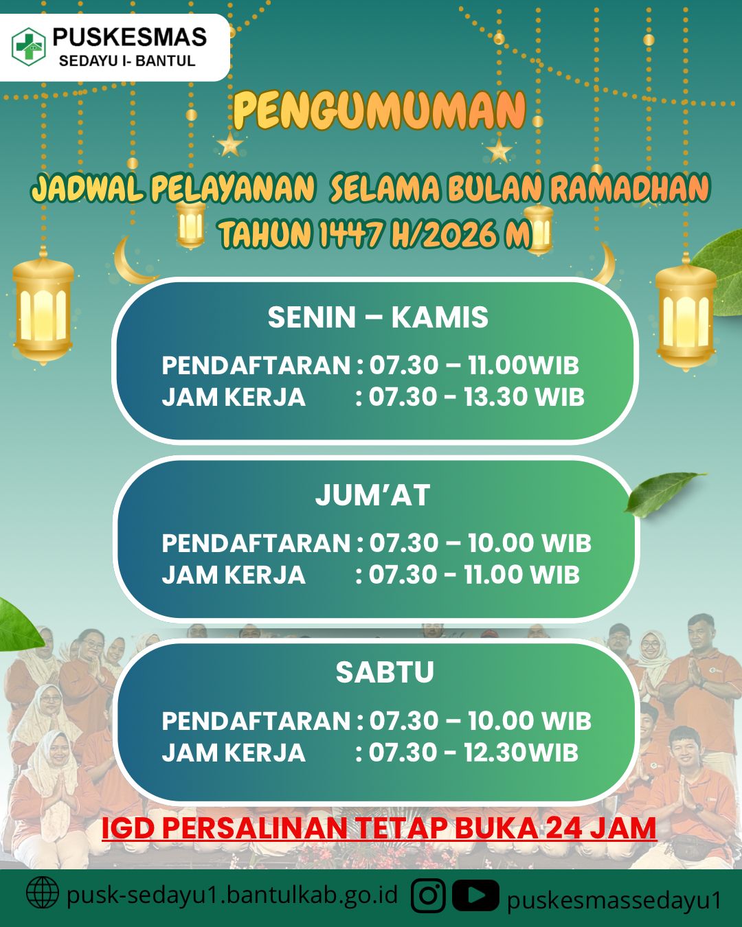 Halo Sahabat Puspita…Berikut kami informasikan jadwal pelayanan di UPTD Puskesmas Sedayu I selama Ramadhan 1447 H / 2026 M